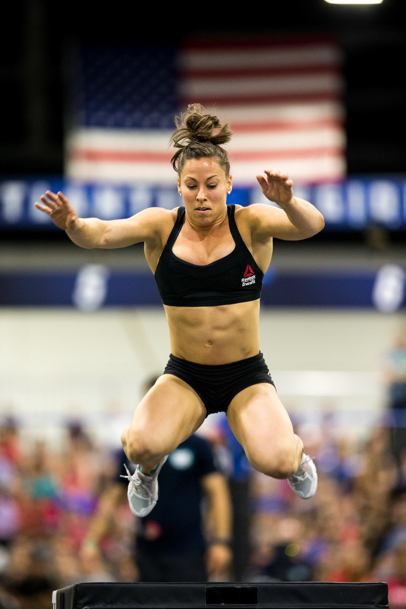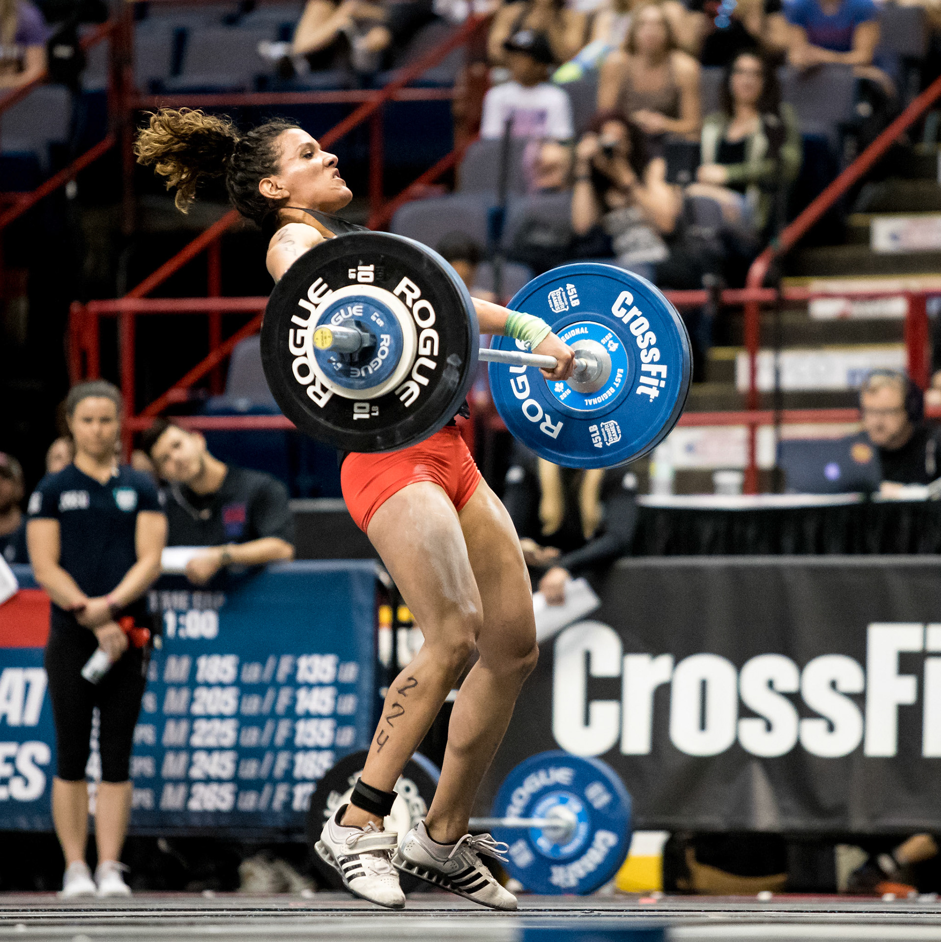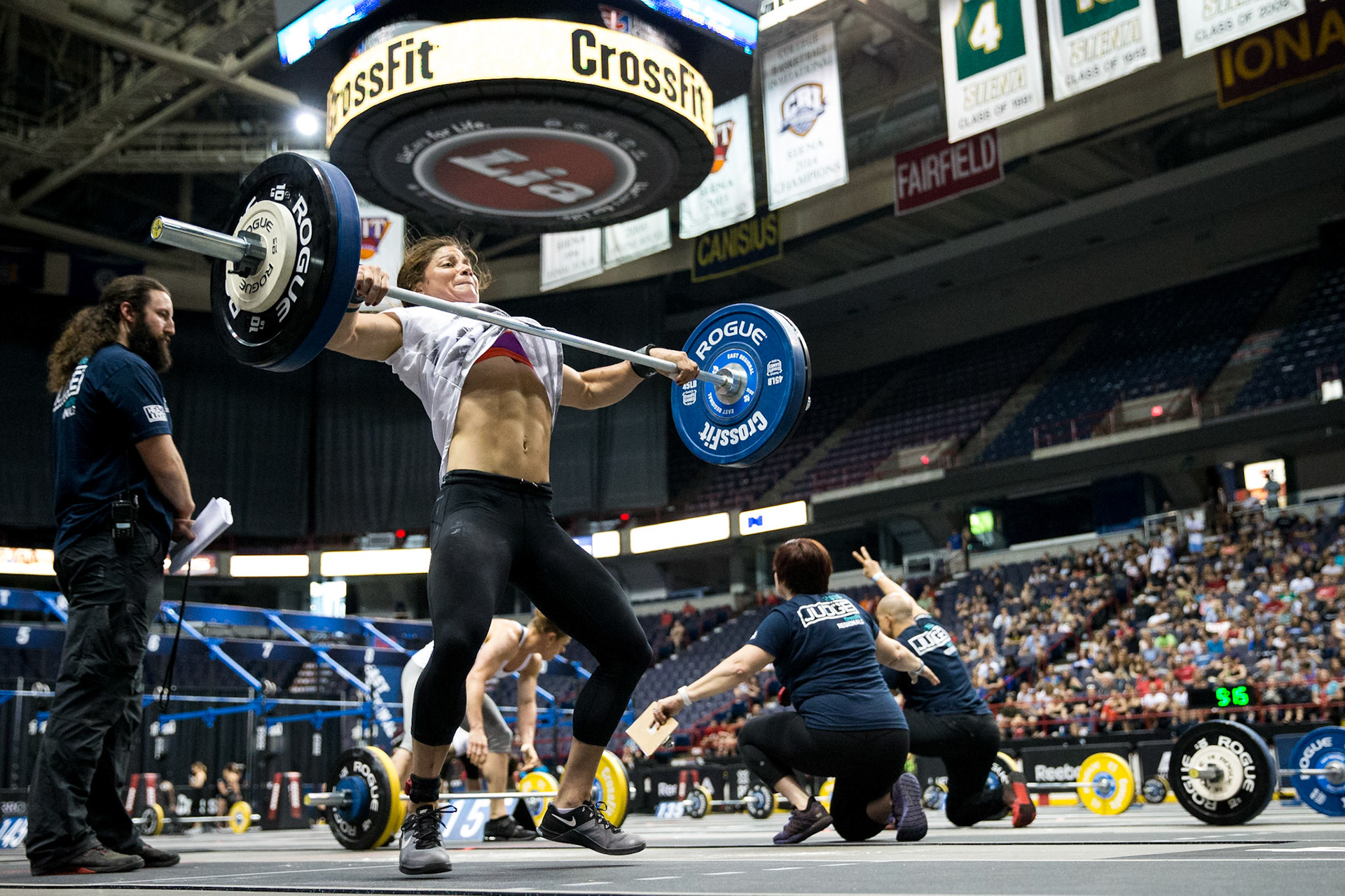 Jenn Jones misses an attempt at a 212 pound clean during the Clean and Jerk event at the 2015 Reebok CrossFIt Games, held at the StubHub Center in Carson, CA.