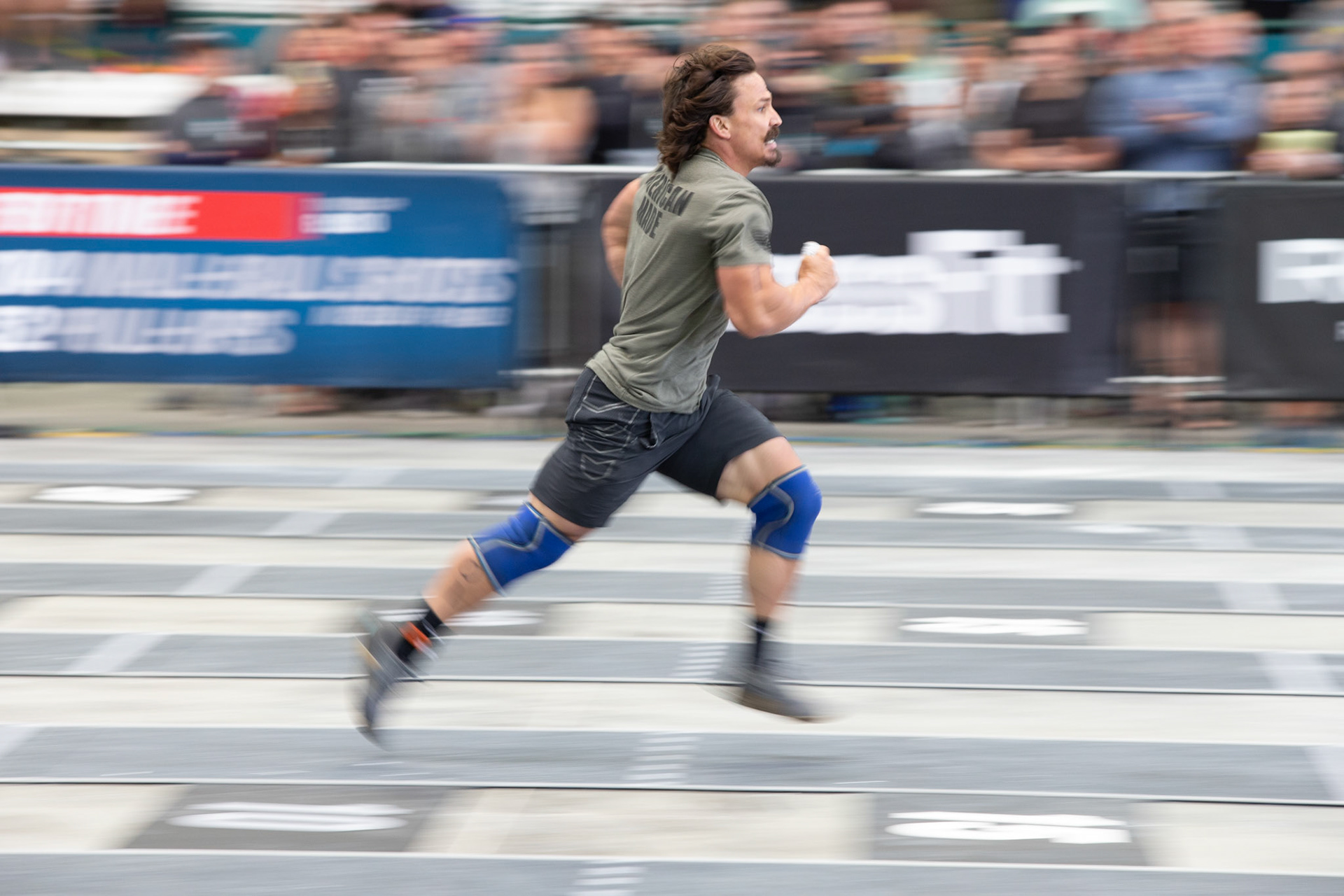 Athletes sprint to the top of a steep hill carrying 70 pounds of sand bags in the 3rd workout of the 2009 CrossFit Games.