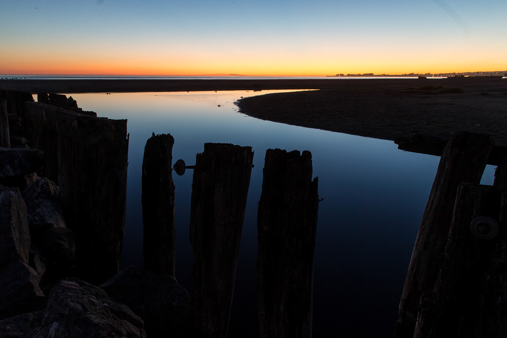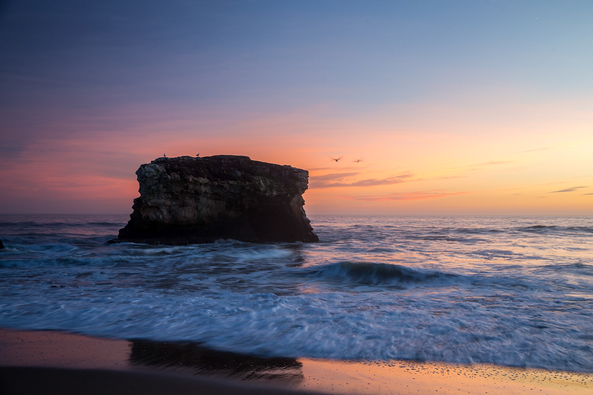 Foam from a wave recedes on the sand of Seacliff State Beach.